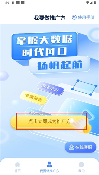 2、接下来,在“我要做推广方”的页面里,点击【立即成为推广方】。