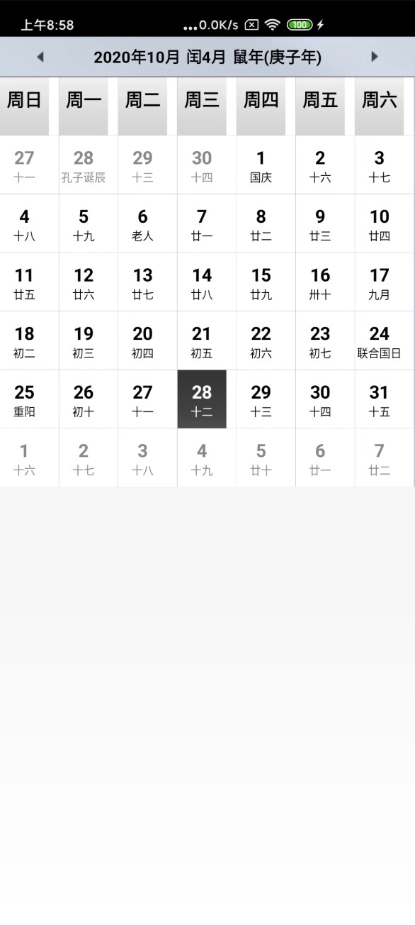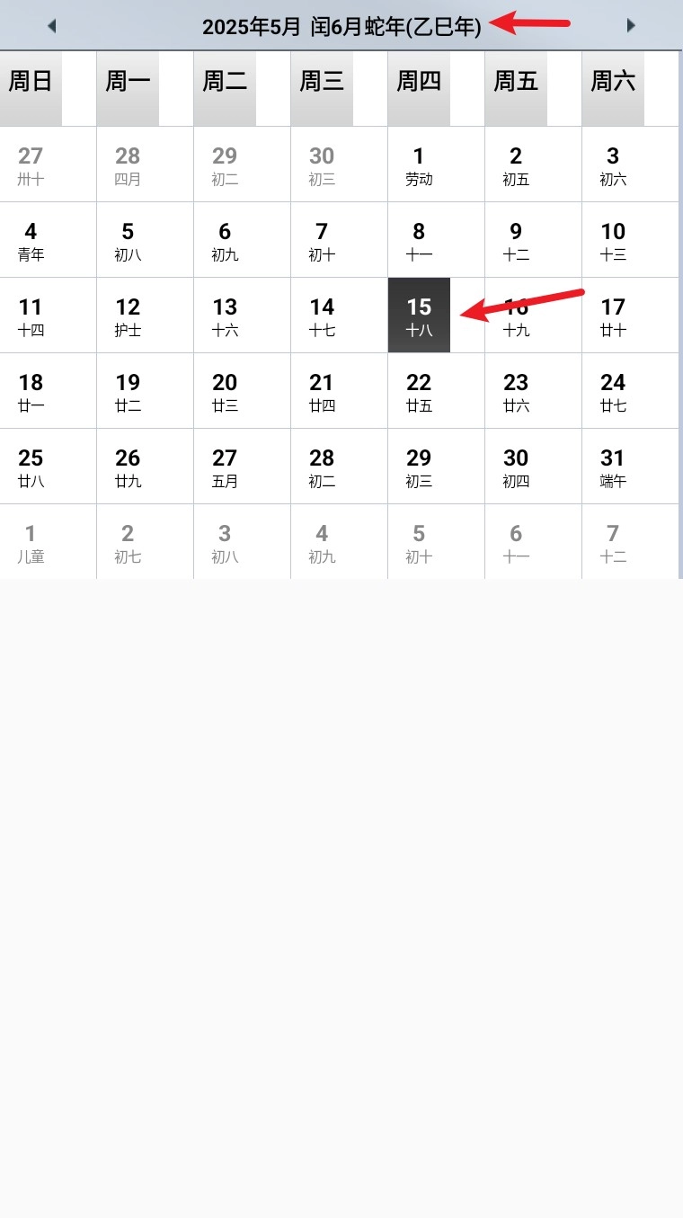 2. 在万年历界面中查看对应年份与农历信息,点击不同日期即可查看节日、农历等日历详情。