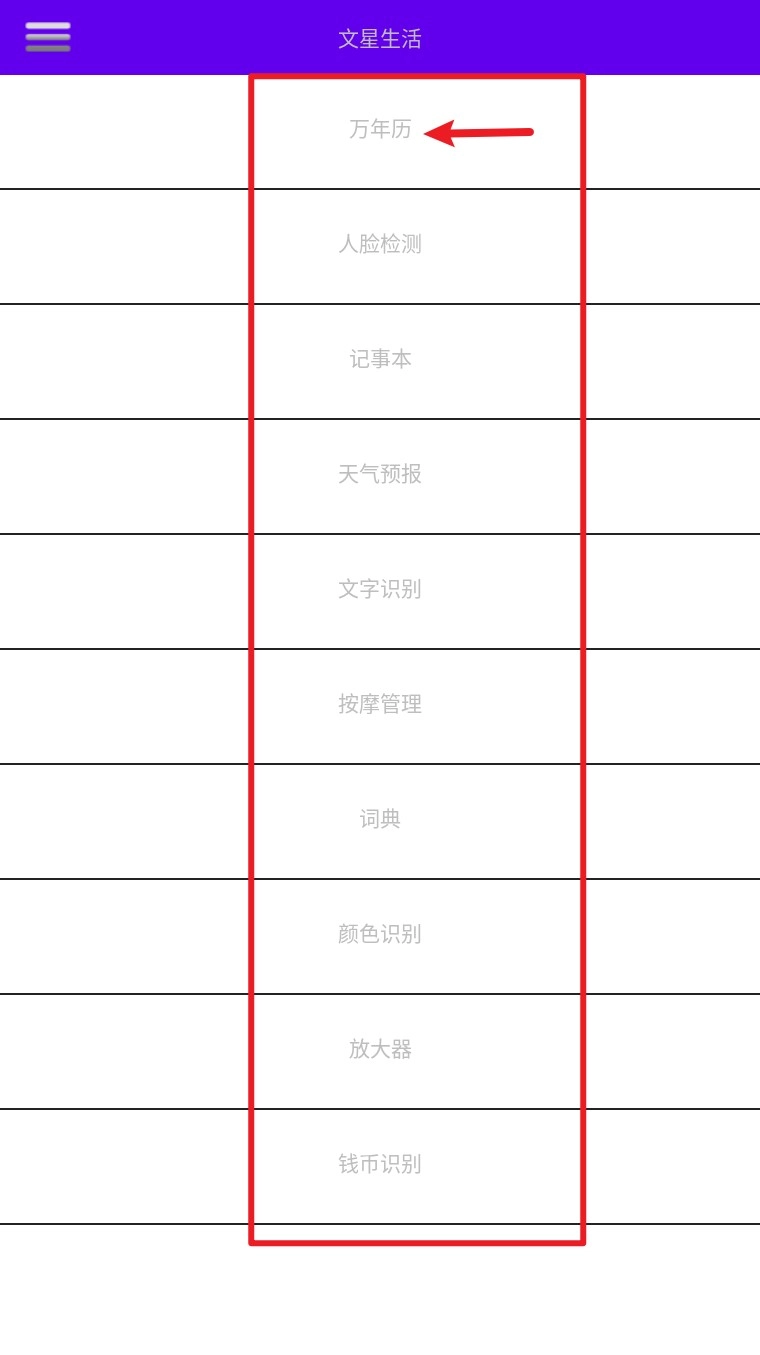 1. 进入 App 首页后点击左上角菜单图标,展开功能列表,选择你要使用的「万年历」模块。
