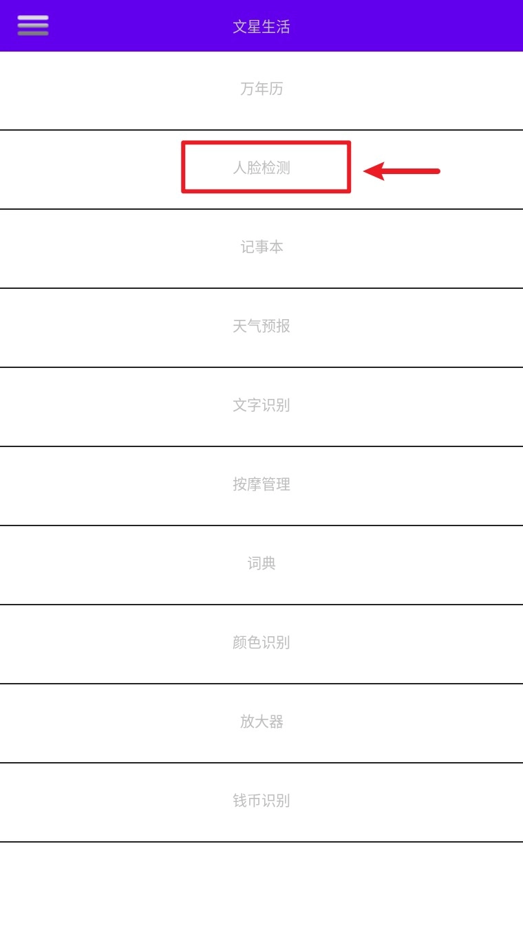 4. 在主菜单中点选「人脸检测」功能,进入页面后点击「拍照识别」按钮进行面部分析操作。