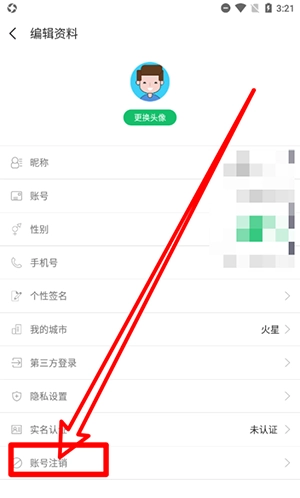 2、在编辑资料界面内,点击【账号注销】