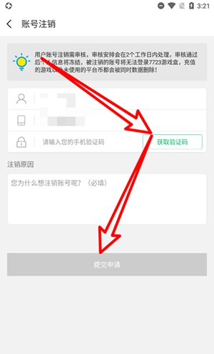 3、在账号注销内,通过短信验证之后,点击‘提交申请’即可