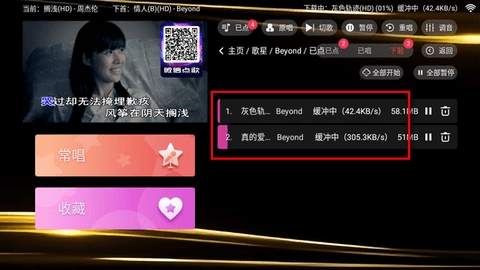 3、点歌后会自动免费下载,然后就可以在线听,看和唱歌了。