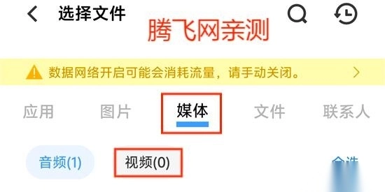 3.在选择文件界面点击媒体,找到你需要传送的视频,选择并发送。