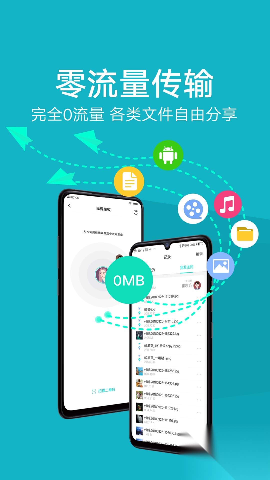 2. 零流量极速分享各类文件,包括音乐、视频、应用、压缩包、图片、文档等