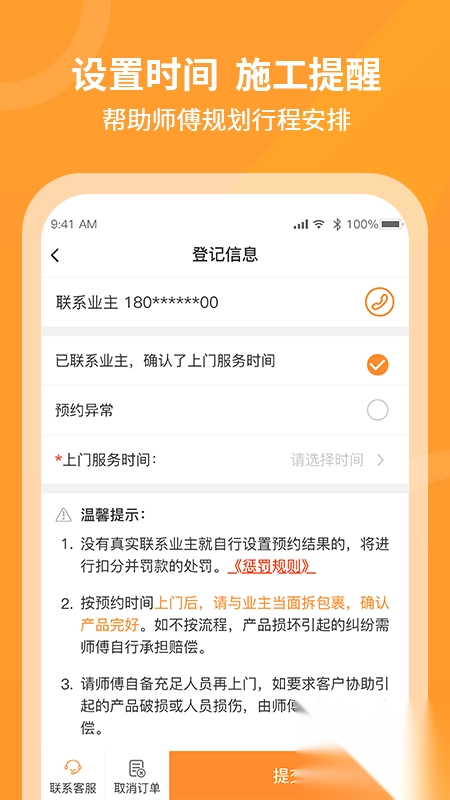【日程安排】师傅设定施工时间后,在施工开始前会收到施工通知,这有助于师傅更合理地规划行程。