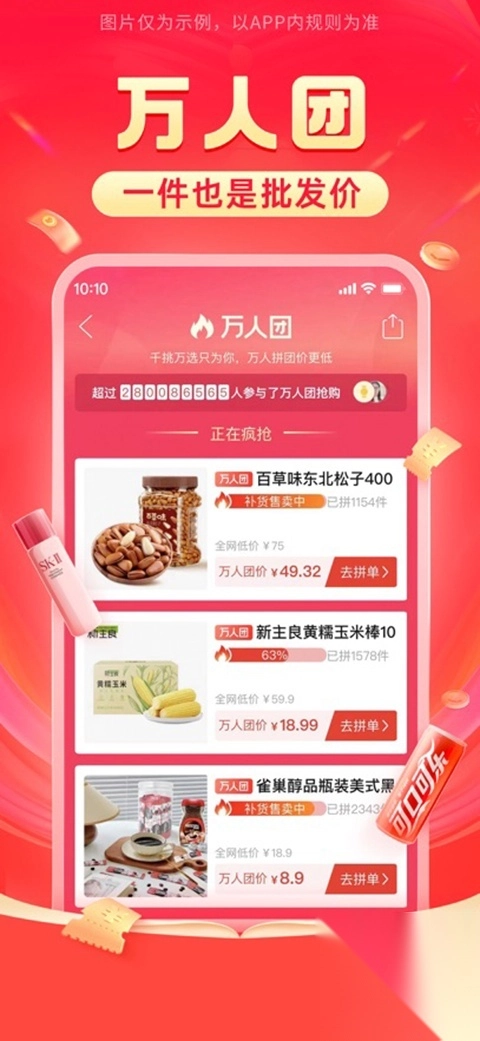 2、和志同道合的好友拼单,或参与万人团,与8亿拼多多用户一起拼。拼团享受更低价,组团购物不孤单。