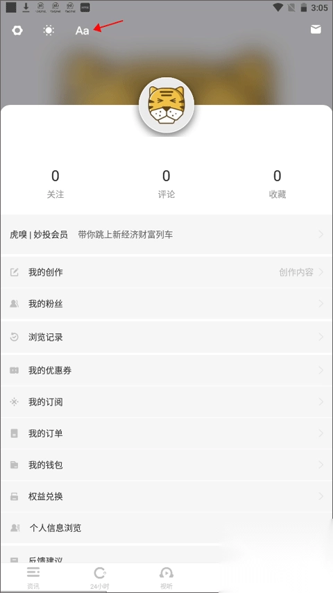 历经多年发展,虎嗅 APP 已然成为众多读者获取灵感与知识的重要途径。其界面设计简洁清爽,操作体验流畅,尤其适配移动端使用。对于渴望了解商业科技领域动态的人群而言,虎嗅 APP 无疑是值得一试的优质选择。1. 借助手机号与验证码完成软件的注册及登录操作后,在主界面由【资讯】切换至【我的】界面,接着点击左上方红色箭头所指的字母图标。
