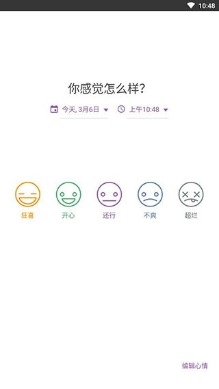 1. 每天打开APP,第一步是选择当天的心情状态。心情状态分为从开心到难过五个等级,点击相应选项就能完成记录。