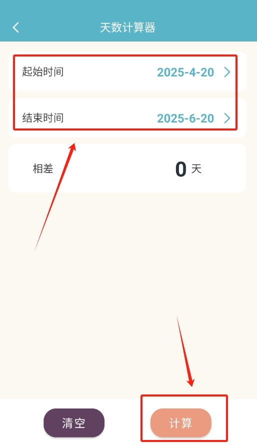2、进入天数计算器页面后,按照格式要求,依次输入起始时间和结束时间,然后点击下方的 “计算” 按钮。