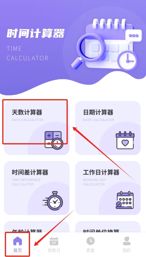 1. 开启夏时时间加速倒数日记录,于软件首页寻觅“天数计算器”选项,点击后进入天数计算页面。