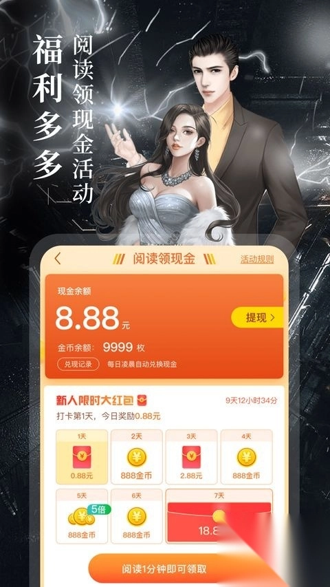 每日狂撒岩币,精彩活动连番登场,福利多到拿不停!想看正版内容、追超爽小说,疯读小说是不二之选!