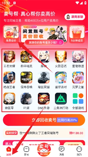 2、进入首页,如图所示,这里提供大量热门游戏的账号回收与免费估价的功能入口。
