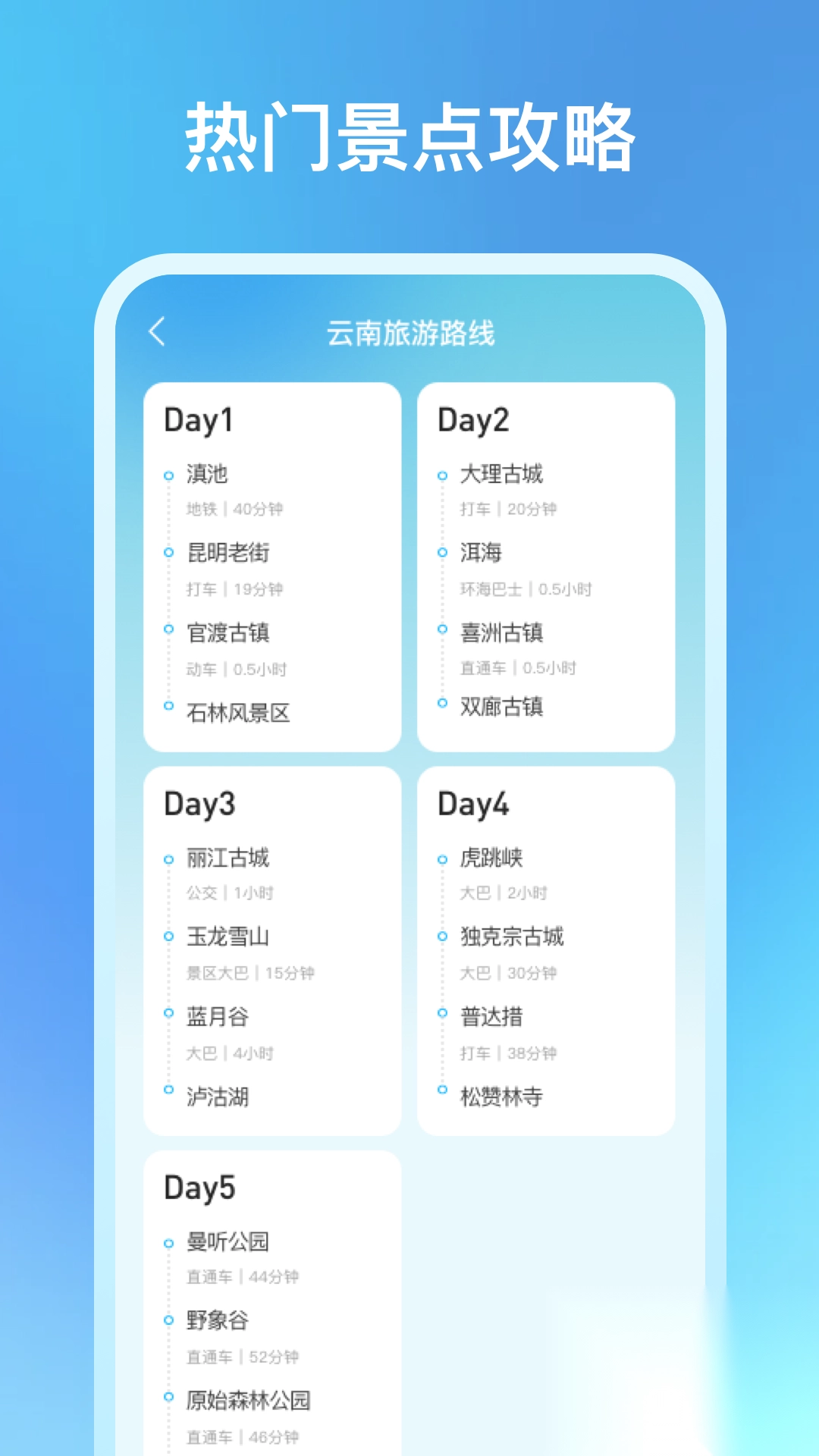 3、涵盖云南等热门目的地详尽的路线攻略,依据行程天数以及交通耗时,给出能够直接参考的旅行方案。