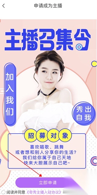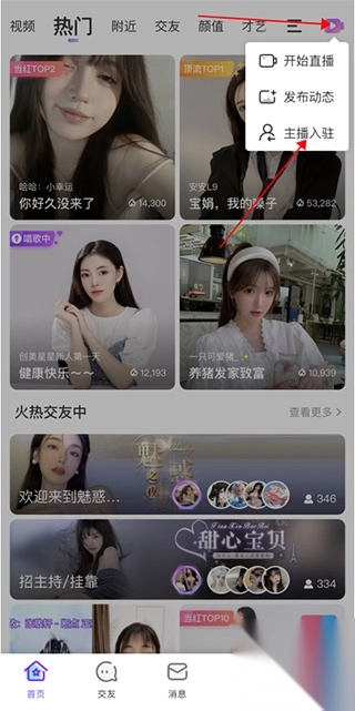 1. 于首页点击右上角的紫色图标,接着点击主播入驻。