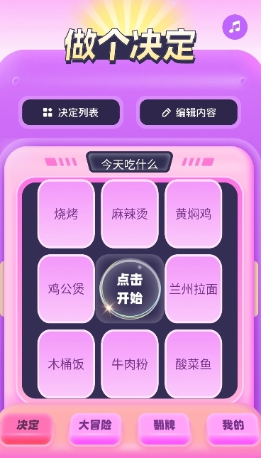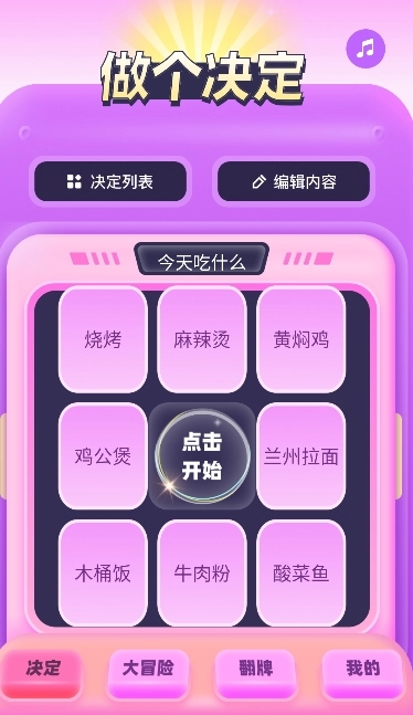 转盘决定器,一款为选择困难症人群精心打造的生活辅助神器。无论是生活琐事、娱乐活动,还是工作事务,当你在众多选项间举棋不定时,它便会闪亮登场。借助趣味转盘、抽签、摇号等多元形式,搭配个性化定制与权重调控等独特功能,转盘决定器能迅速且公正地给出决策答案,助力你轻松摆脱纠结,快速做出决定!