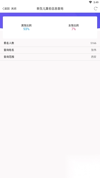 3、查询顺利完成,从图中能够清晰看到同名人数以及男女占比等相关信息,使用起来非常便捷。