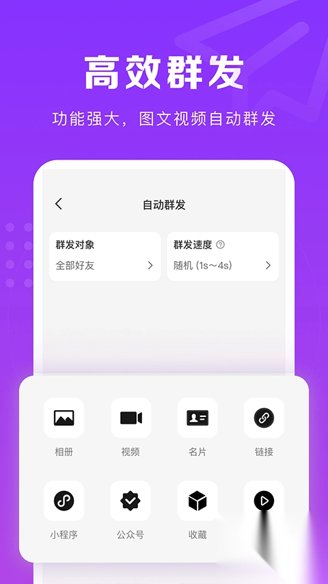 1、群发助手:图文群发、小程序群发、公众号群发、文章群发,群发发送的对象不仅仅是用户的好友,还可以群发至用户所在的群,快速将消息曝光,大大提高电商销售推广效率