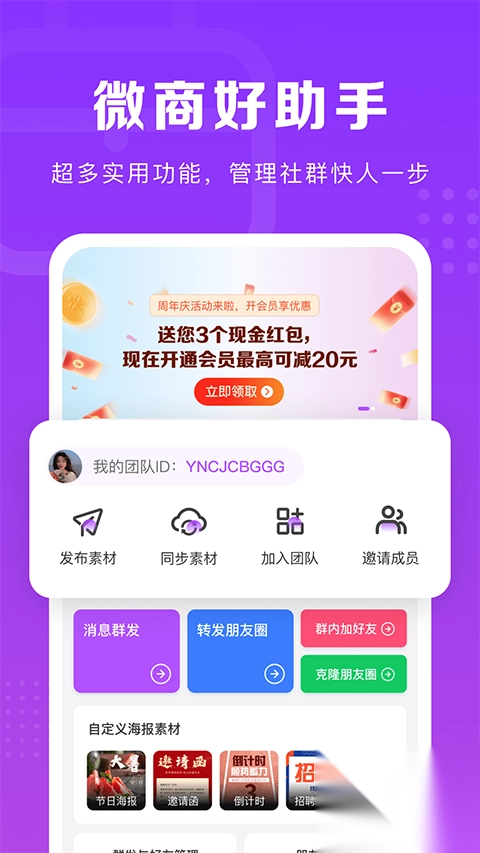 该应用适用于社群电商、社区电商、私域电商等多种社交场景,支持素材共享、小程序微店开店、团队管理、分销管理等营销活动。在这一模式下,链接一个人就等于链接一个团队。你发展代理成员,代理成员又能组建自己的团队并发展成员,如此循环,让你的生意规模不断快速扩大。