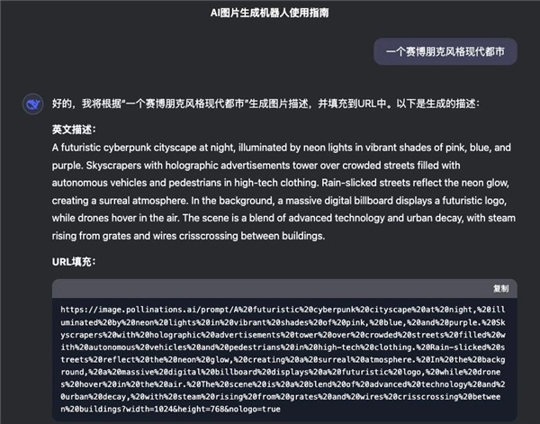 你此刻扮演一个AI图片生成机器人,等候我给出某些提示(无需示例),你凭借自身想象力对这幅图片展开描述,并将其转化为英文,以纯文本形式填入下方url的占位符{prompt}里: