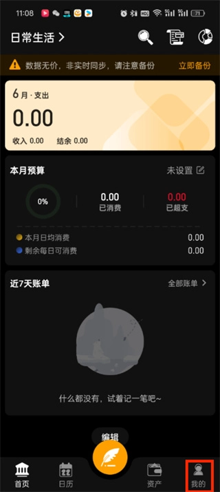 1、打开木木记账软件,进入首页后,我们可以切换到日历、资产、我的页面点击右下角的【我的】选项