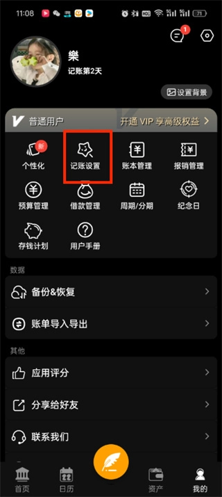 2、在我的页面中会有个性化、预算管理、记账设置、借款管理等,点击【记账设置】