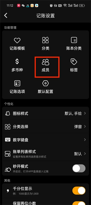 3、来到记账设置的页面中可以看到多币种、记账选项、成员、默认配置、标签等功能,点击【成员】
