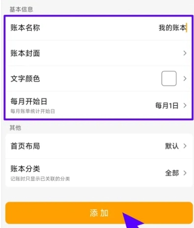 3、进入新建账本界面,设置账本的基本信息,点击【添加】