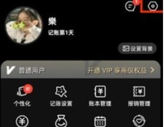 2、在“我的”页面中,看到个性化、记账社会、账本管理等功能。点击右上角的【设置图标】