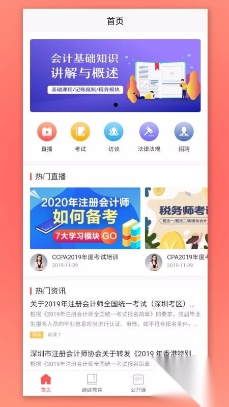 CPA生涯app,是深圳市注册会计师协会专为注册会计师从业者打造的学习软件。借助该软件,用户能够实现多项功能,如在线继续教育报名、在线学习、在线直播课程学习以及题库练习,轻松攻克知识学习难题。软件首页设有直播、考试、访谈、法律法规、招聘这五大板块,全方位助力用户,让他们更好地了解会计师行业动态与知识点信息,随时随地开启在线直播学习。有此需求的朋友,赶紧下载CPA生涯app安装使用吧!
