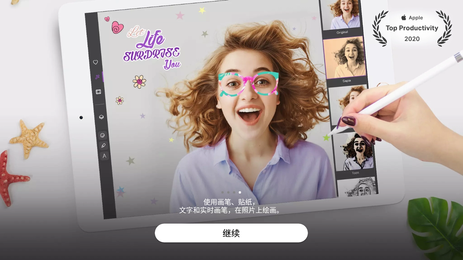 1. 在绘画桌中文版中下载并使用笔刷、标签以及即时笔刷,在相片上进行作画。