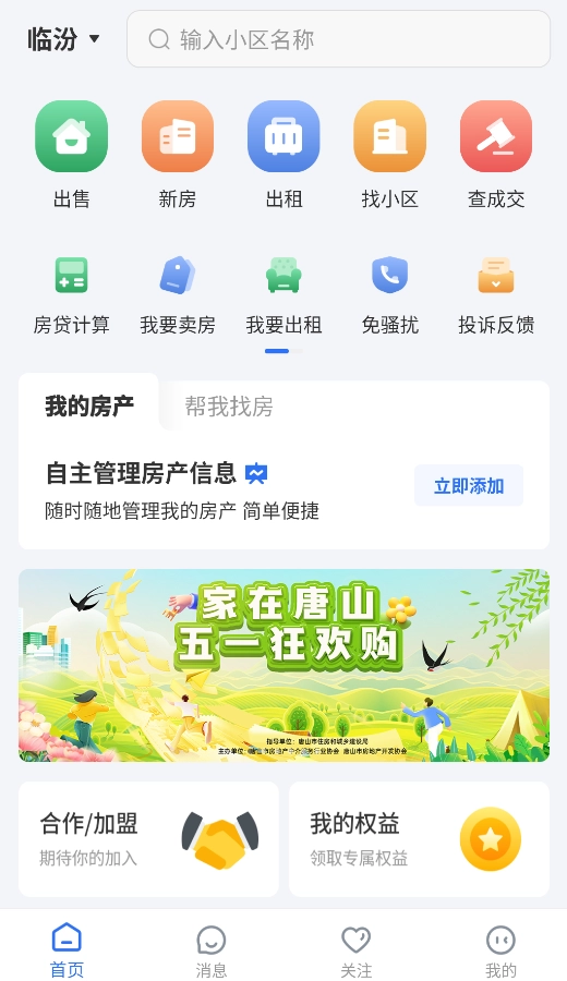 1. 打开临汾房产交易网APP,其首页整合了二手房出售、新房推荐、房屋出租等多种房产服务功能。