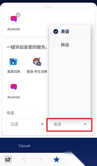 1、进入后,打开底部收藏页,点击图示处,选择英语、韩语。