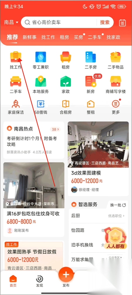 1、下载安装好安装好58同城,进入软件,点击上方的找工作,如图所示。