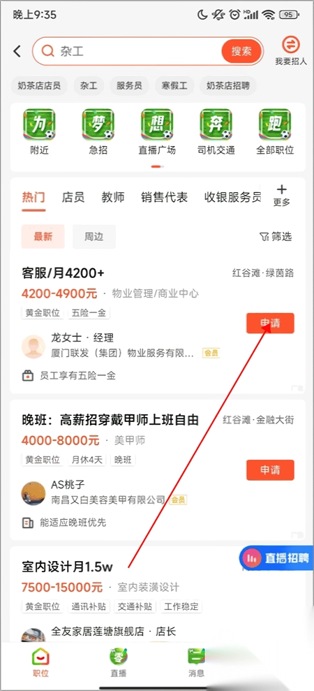 2、进入之后你可以寻找适合自己的工作,点击右边的申请。