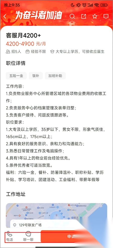 3、进入之后可以查看工作内容详情,点击申请下方的申请职位即可投递简历,还能进行电话和聊一聊进行沟通。
