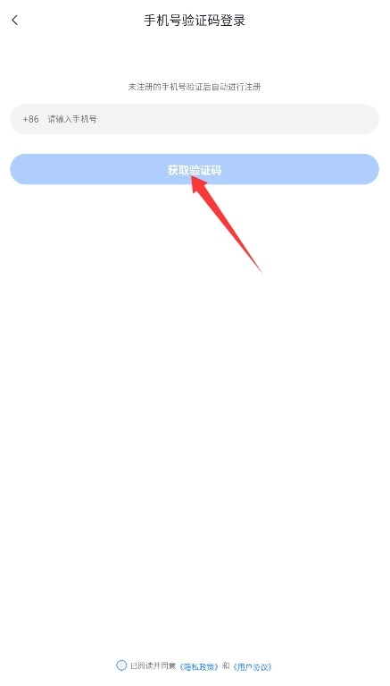 2、输入手机号获取验证短信,填写验证码并勾选用户协议后,完成登录流程。