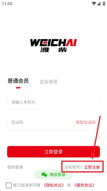 下载安装并打开潍柴同行app,进入登录界面后点击没有账号? 立即注册