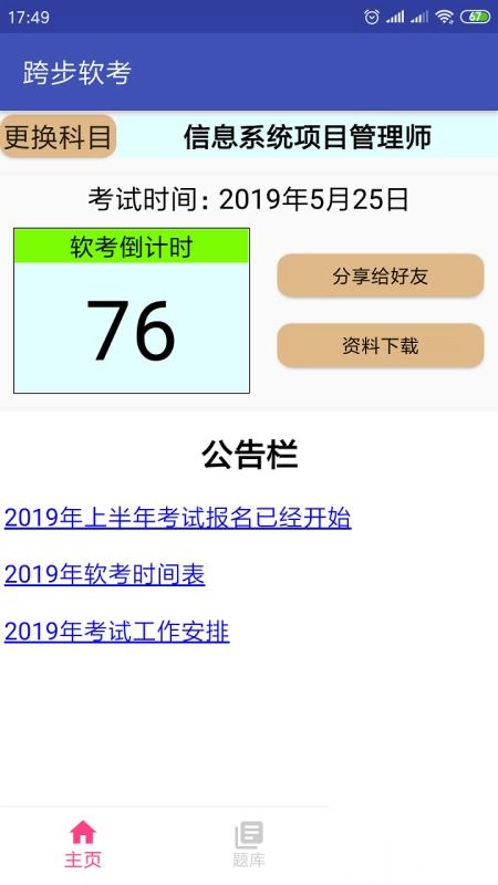 2、点击主页,浏览考试倒计时,查看公告信息获取最新资讯