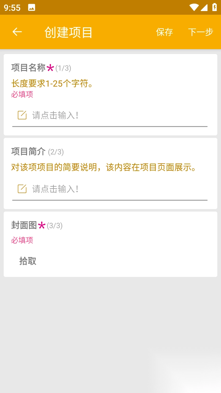 2、添加项目名称、简介及封面图(三项必填),点击下一步。