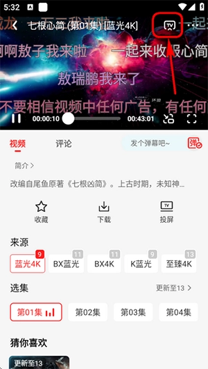 2. 打开视频播放界面,点击右上角的“tv”标识。