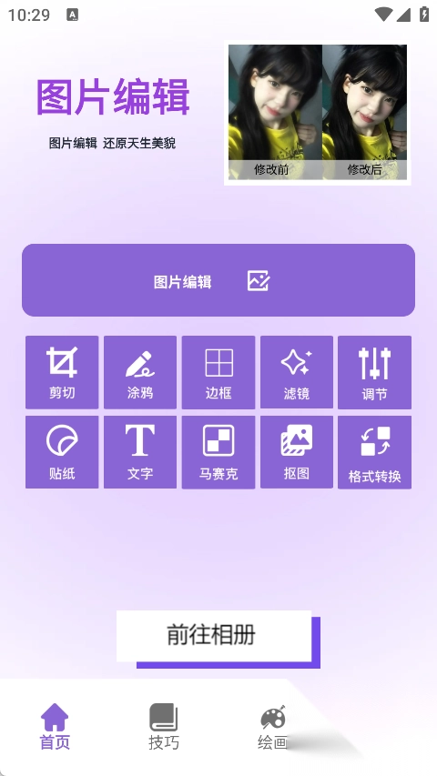 1、首页具备图片编辑、剪切、涂鸦、添加边框、应用滤镜以及进行调节等功能。
