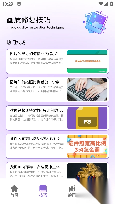 2、于技巧页面,使用户能够及时知晓各类画质修复技巧,熟悉不同修复操作。