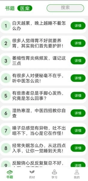 在主界面中,用户能够查看书籍、药材、方剂以及医案等各个不同模块的内容。