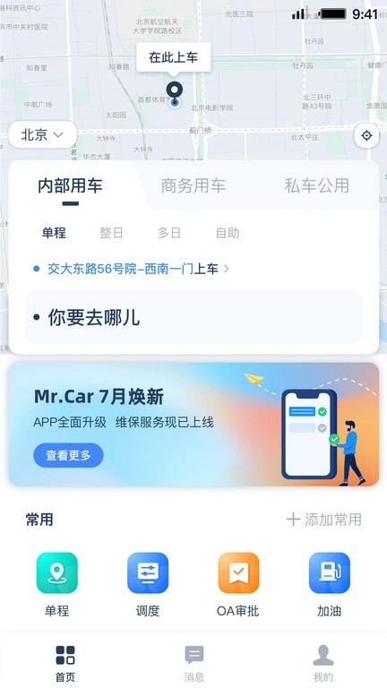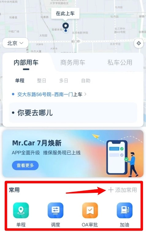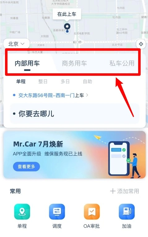 1、 在首页选择用车类型,可切换内部用车、商务或私车公用。