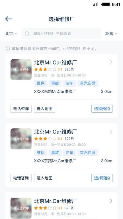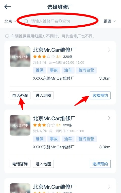 3、 搜索维修厂后可电话咨询或预约服务,支持地图导航。