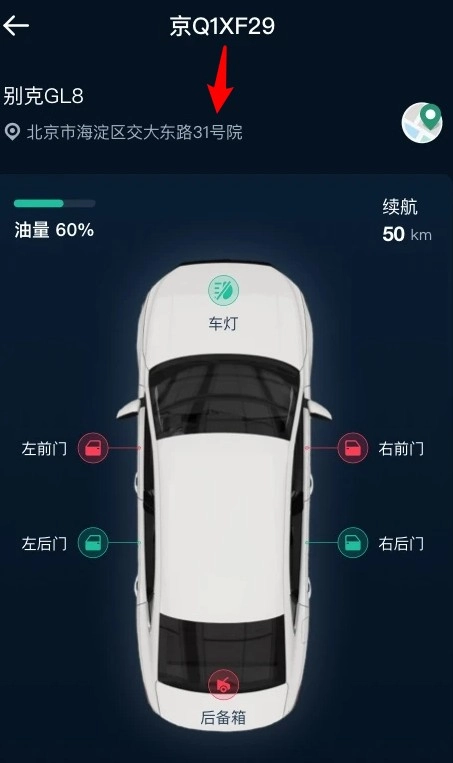 4、 车辆详情页显示当前油量、位置与车门状态等实时信息。