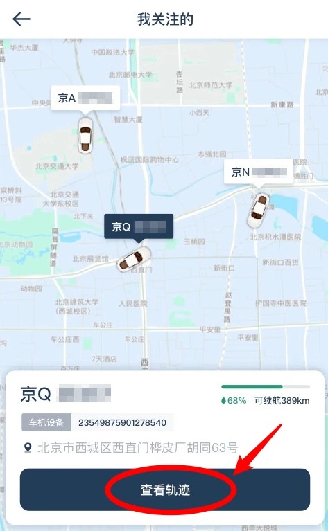 5、在“我关注的”页面,不仅能够查看车辆定位,还可点击进行轨迹回溯。