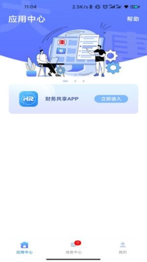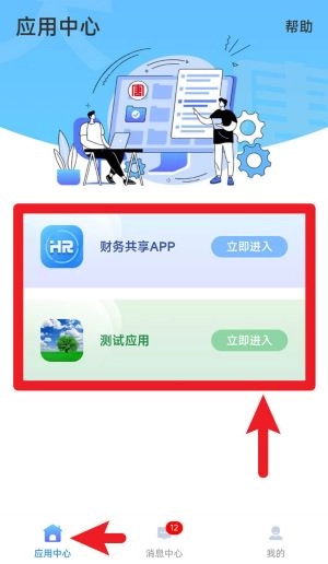 1、打开应用中心后可以看到财务共享APP与测试应用,点击“立即进入”即可访问目标应用。