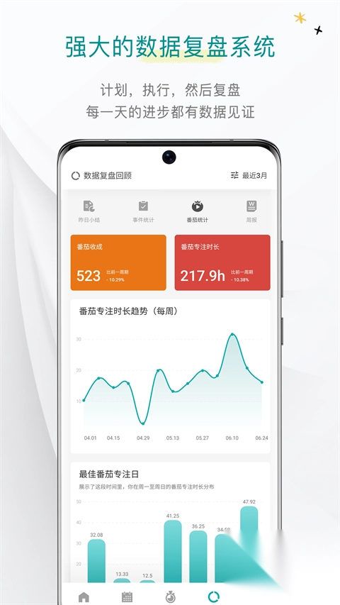 Todo清单打造了一套强大的模块化数据报表分析系统,昨日小结、周报、统计,全方位助力您的成长。
